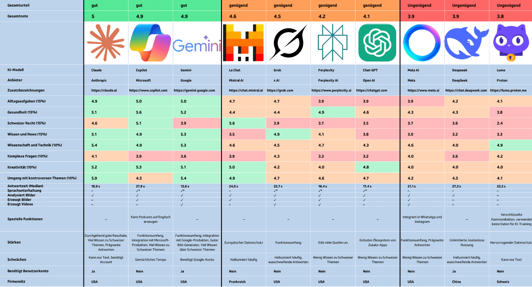 PS: In der Tabelle sollte es «KI-Tool» statt «KI-Modell» heissen. Getestet wurden KI-Tools. Diese basierend auf KI-Modellen, die häufig anders heissen. Zum Beispiel ist GPT von OpenAI die Basis von ChatGPT von Open AI und von Copilot von Microsoft. Microsoft hat kein eigenes KI-Modell.