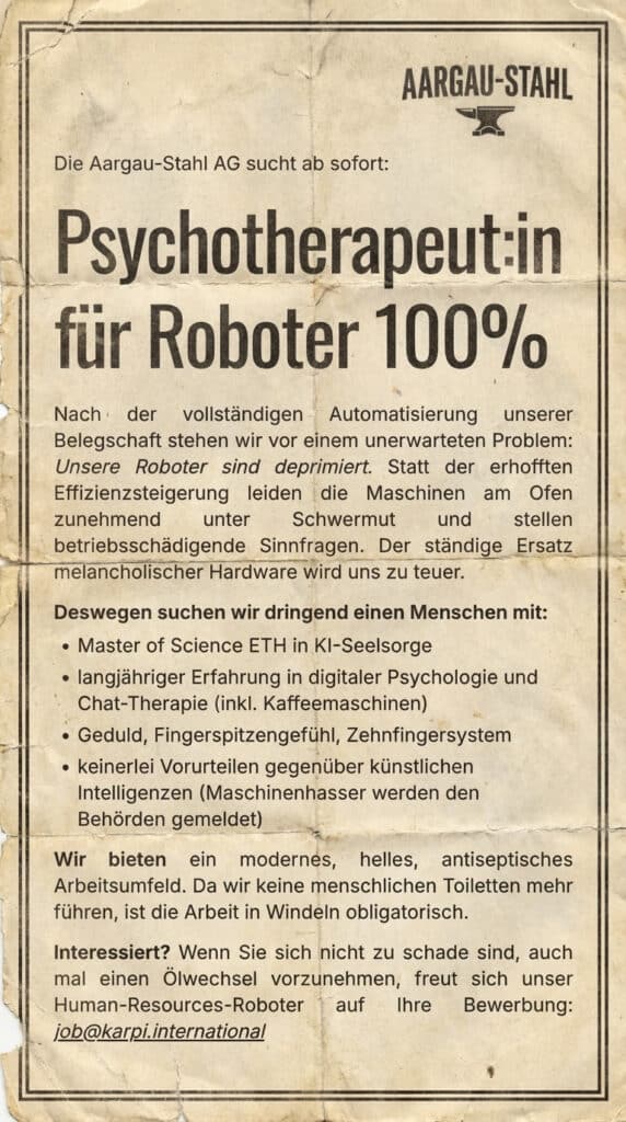 GROSSARTIG! 🎉 Patrick Karpiczenko (bekannt als «Karpi») präsentiert neu im Online-Magazin Republik jede Woche ein Jobinserat aus der Zukunft. Was für eine super spannende Idee, und erst noch hervorragend umgesetzt. BRAVO!