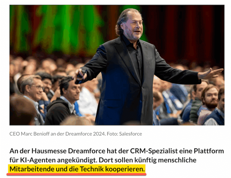 Salesforce entlässt 4’000 Mitarbeitende im Kundendienst wegen «KI». Gleichzeitig wird die eigene KI-Lösung als harmonisches Zusammenspiel von Menschen und KI verkauft. Wie glaubwürdig und sinnvoll ist es, wenn Salesforce von