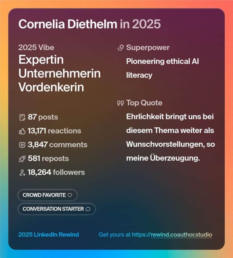Was für eine motivierende Spielerei! Noch spannender als diese Auswertung finde ich zwei Hinweise, die sich (offenbar) wie ein roter Faden durch meine LinkedIn-Präsenz ziehen und mir zwei Pokale eingebracht